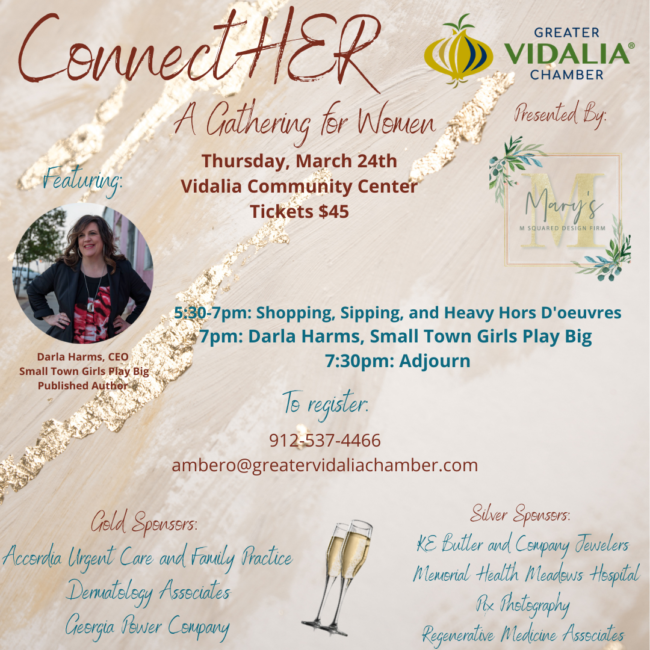 Grab All the Girls For ConnectHER! Registration is now OPEN for 2022 ConnectHER! Grab your girlfriends and join us for a night of fun with shopping, sipping and sampling followed by a short program by Darla Harms, CEO of Small Town Girls Play Big. Call us at 912-537-4466 to reserve tickets! Presented By: Mary’s /…